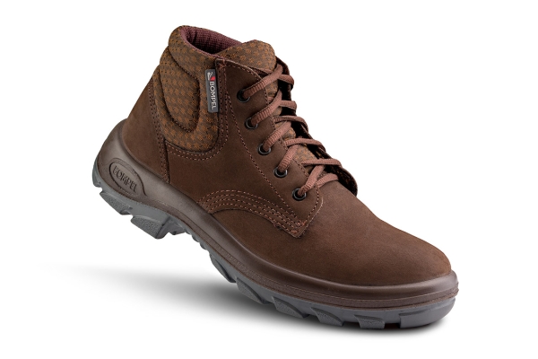 Calçado ocupacional, tipo bota até o tornozelo, confeccionada em vaqueta nobuck, fechamento em cadarço, palmilha de montagem, palmilha interna removível, solado em poliuretano bidensidade, resistente a óleos combustíveis, injetada direto no cabedal.